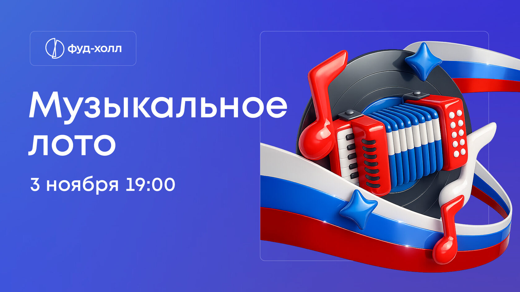 Приглашаем вас отметить День народного единства на фуд-холлах! Проведите вечер, погрузившись в атмосферу патриотичного праздника и духа сплоченности! Насладитесь музыкальными хитами, а также кулинарными шедеврами от наших корнеров!